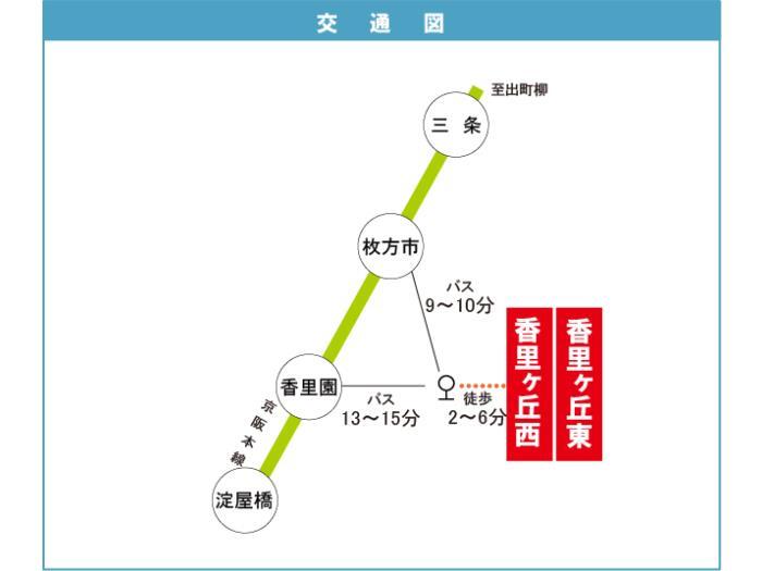 京阪本線 『 香里園駅 』 バス13分 バス停『香里橋』 徒歩2分 京阪本線 『 枚方公園駅 』 バス14分 バス停『香里橋』 徒歩2分 |
