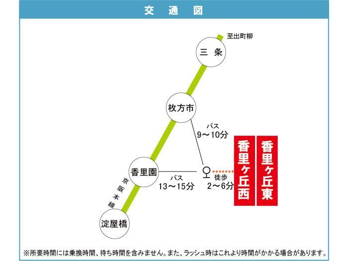 京阪本線 『 香里園駅 』 バス13分 バス停『香里橋』 徒歩2分 京阪本線 『 枚方公園駅 』 バス14分 バス停『香里橋』 徒歩2分 |