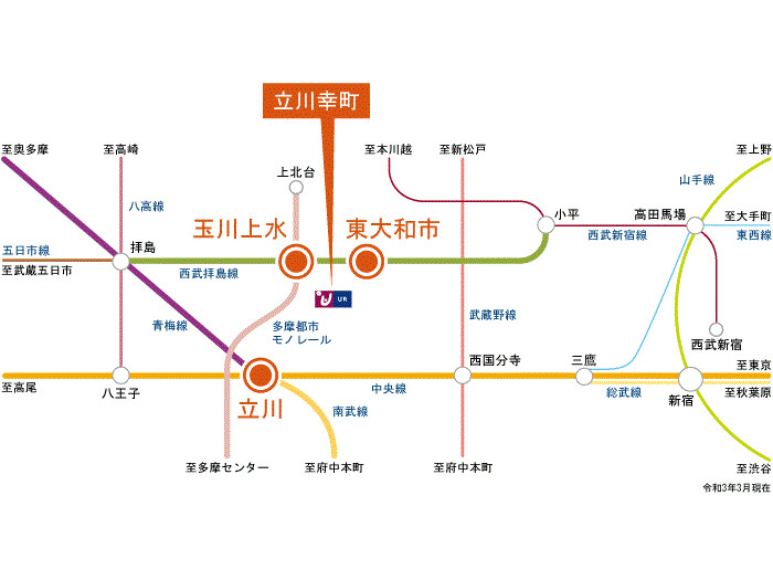 多摩都市モノレール 『 玉川上水駅 』 徒歩15分 JR中央線 『 立川駅 』 バス20分 バス停『幸町団地』 徒歩3分 JR南武線 『 立川駅 』 バス20分 バス停『幸町団地』 徒歩3分 JR青梅線 『 立川駅 』 バス20分 バス停『幸町団地』 徒歩3分 |