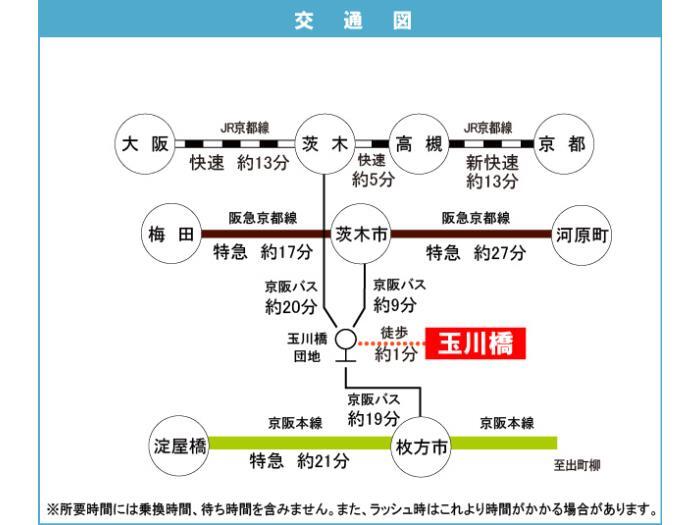 JR 東海道・山陽本線 『 茨木駅 』 バス22分 バス停『玉川橋団地 』 徒歩2分 阪急京都線 『 総持寺駅 』 徒歩35分 |