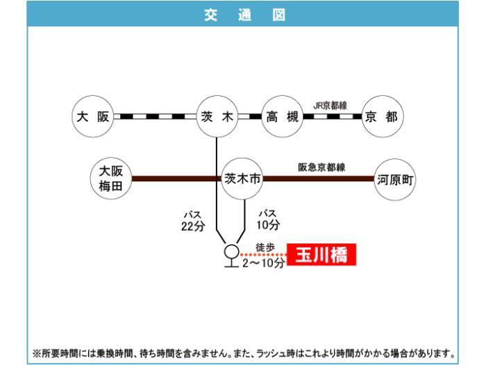 JR 東海道・山陽本線 『 茨木駅 』 バス22分 バス停『玉川橋団地 』 徒歩2分 阪急京都線 『 総持寺駅 』 徒歩35分 |